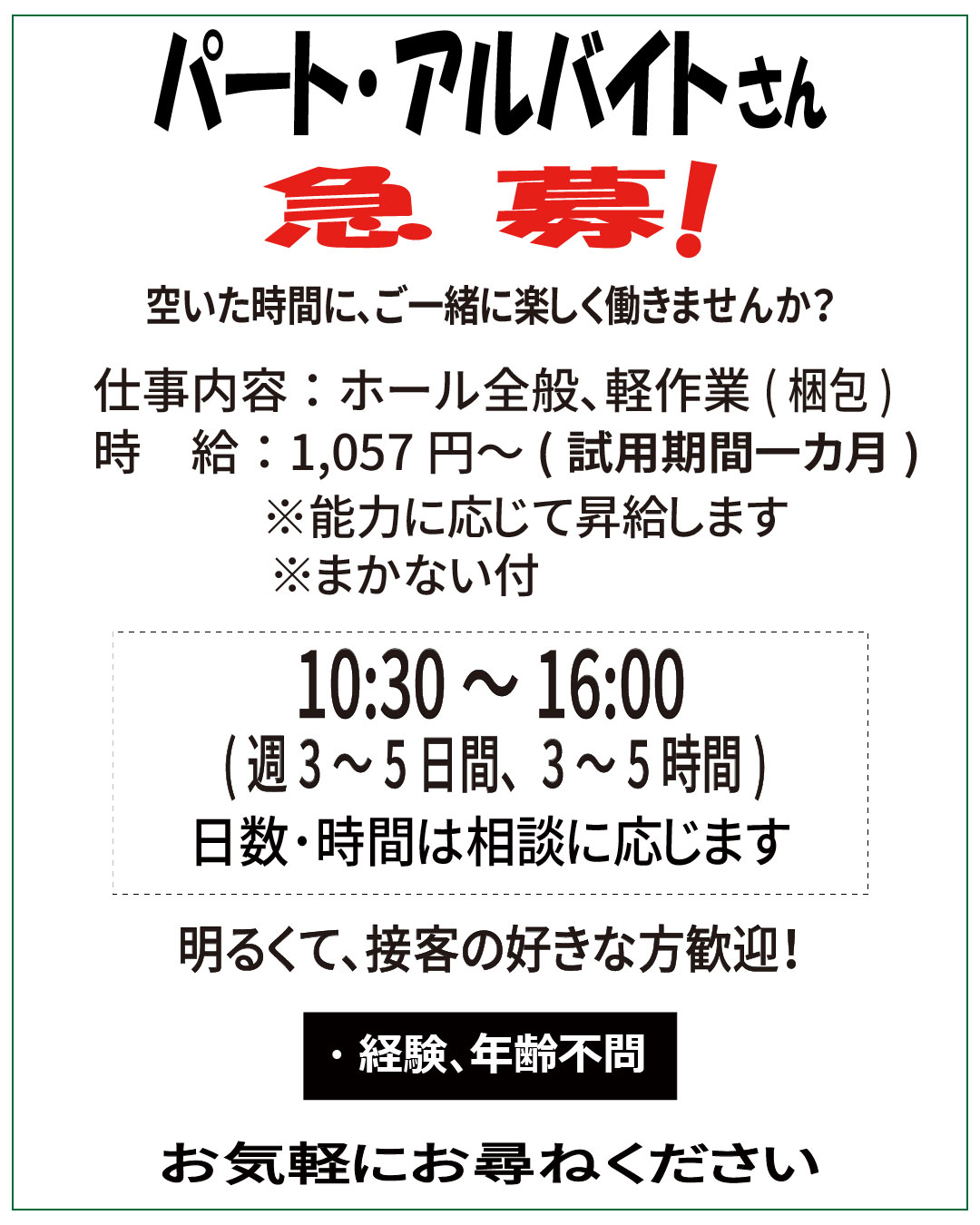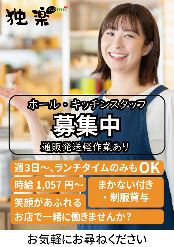 お知らせ 鞍手町とその周辺地区のスタッフ募集のお知らせです! 只今、独楽では、スタッフさんを募集しています。 鞍手町と周辺地区(遠賀町、中間市、直方市、宮若市、宗像市)在住の方が対象になります。 年齢は問いませんが、50代・60代の方が働きやすい職場環境になっています。 面接は履歴書ご持参ください。 お気軽に 【お問い合わせ】 電話をかける☎0949(42)7345パート・アルバイト募集 求人 タグ: お知らせスタッフ募集求人